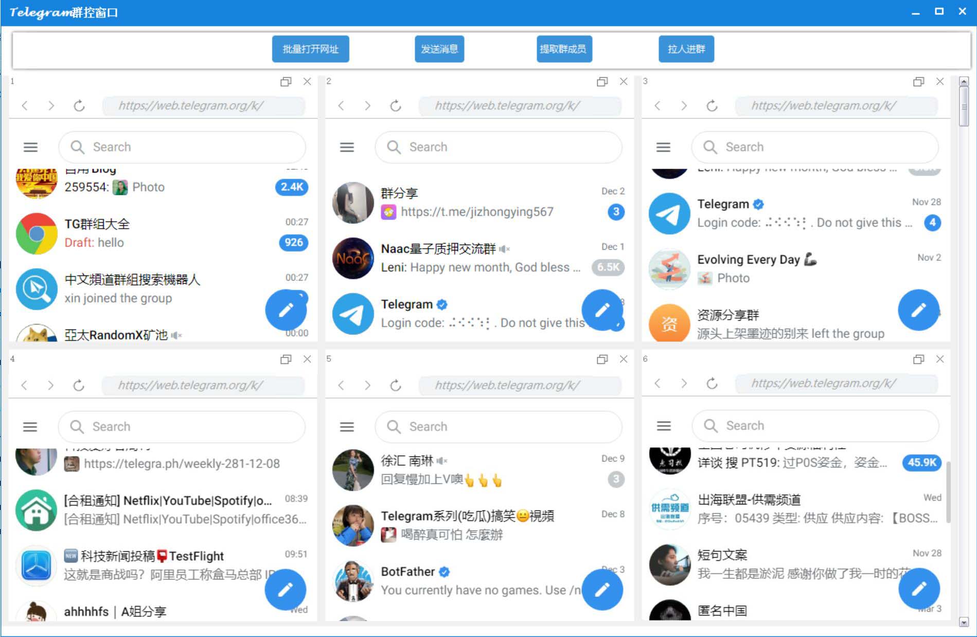 • 支持多个账号同时发送消息、提取群成员、拉人进群、关键词采集群、加群